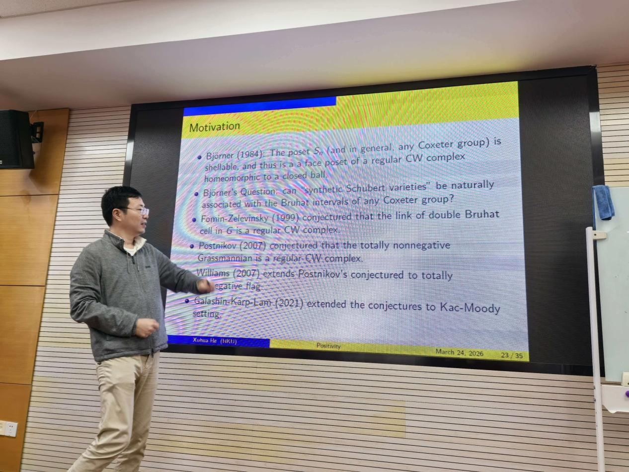 2026年3月24日下午,“代数与几何系列报告”在格物楼永利皇宫官方网站数学研究中心528报告厅隆重举行。国际知名数学家、香港科学院院士、香港大学讲座教授何旭华应邀作了题为“Total positivity: combinatorics,geometry, and representation theory”的学术报告。